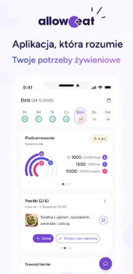 Odkryj nowy wymiar dbania o zdrowie i osiągania celów żywieniowych z alloweat. Ta innowacyjna platforma płynnie integruje technologię z profesjonalnym wsparciem dietetyka, tworząc spersonalizowaną ścieżkę do lepszego samopoczucia. Już od pierwszego spojrzenia na zakładkę „Dziś" zyskujesz kompleksowy przegląd: od statusu realizacji celów kalorycznych i liczby posiłków, przez kluczowe podsumowania i raporty od specjalisty, aż po stopień nawodnienia i zaplanowane listy zakupów. Wszystko to przedstawione w intuicyjnych, interaktywnych kartach, które pozwalają na błyskawiczne przejście do szczegółów każdego modułu, ułatwiając zarządzanie codziennym planem.