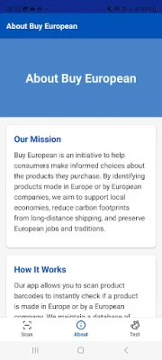 Aplikacja „Buy European" wspiera świadome wybory konsumentów. Pomaga identyfikować produkty wytwarzane w Europie, wspierając lokalne gospodarki, redukując emisję CO2 i chroniąc europejskie miejsca pracy oraz tradycje. Dokonuj przemyślanych zakupów.