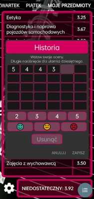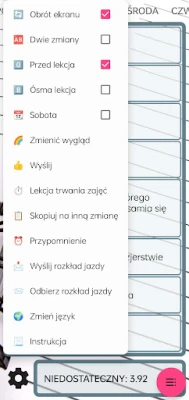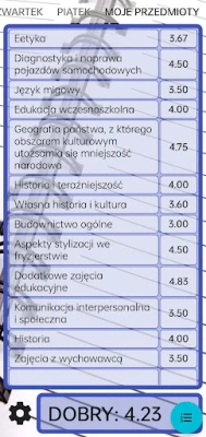 Spersonalizuj swój plan lekcji, nadając mu unikalny charakter. Mój szkolny plan lekcji oddaje do Twojej dyspozycji bogactwo stylów, motywów, kolorów i efektów przejść, a nawet opcję zmiany tła, dzięki czemu Twój harmonogram będzie zawsze wyjątkowy i idealnie dopasowany do Twoich preferencji. Poza organizacją czasu, aplikacja umożliwia także przechowywanie ocen z wszystkich przedmiotów – do 30 wyników liczbowych (w skali 2-5) na każdy przedmiot. Nigdy więcej nie zapomnisz o ważnych terminach: z łatwością ustawisz przypomnienia o sprawdzianach, egzaminach czy zajęciach dodatkowych, które zostaną zintegrowane z kalendarzem Androida. A co najważniejsze, możesz szybko wysłać swój plan zajęć mailem do znajomych z klasy, oszczędzając im czas na ręczne przepisywanie.