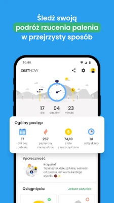 Aby utrzymać motywację na najwyższym poziomie, QuitNow celebruje każdy Twój sukces. Odkryj ponad 80 kamieni milowych, opartych na liczbie niewypalonych papierosów, dniach bez dymu i zaoszczędzonych funduszach – małe zwycięstwa, które budują wielką zmianę. Śledź również, jak Twoje ciało regeneruje się i wraca do zdrowia dzięki wskaźnikom bazującym na danych Światowej Organizacji Zdrowia. Wątpliwości? QuitNow AI jest zawsze gotowe, by dostarczyć rzetelnych informacji, a starannie wybrane książki poszerzą Twoją wiedzę o skutecznych technikach. Komfort użytkowania zwiększa wsparcie dla Wear OS, umożliwiając monitorowanie postępów bezpośrednio z nadgarstka. Z QuitNow Twoja droga do życia wolnego od tytoniu jest wspierana na każdym kroku.