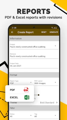 Wyjątkowa elastyczność SnagBricks przejawia się w możliwości generowania oraz pełnej personalizacji raportów. Twórz profesjonalne zestawienia w formatach PDF i Excel, wybierając spośród wielu motywów i generując różne wersje dokumentów, które można następnie wysłać bezpośrednio z aplikacji na dowolne konto. Pełna personalizacja obejmuje dostosowanie wszystkich etykiet w aplikacji – na przykład zmień „element" na „usterkę", „defekt" lub „obserwację", a także dostosuj format daty. W dowolnym momencie możesz zaktualizować nazwę firmy, logo, podpis oraz nazwisko audytora, by raporty zawsze odzwierciedlały Twoją markę. SnagBricks to wszechstronne rozwiązanie dla audytów, kontroli jakości, list usterek, ocen stanu i wielu innych zadań, które wymagają precyzyjnego dokumentowania i raportowania. Odkryj jego możliwości, aby Twoje inspekcje i analizy stały się zorganizowane i bezproblemowe.